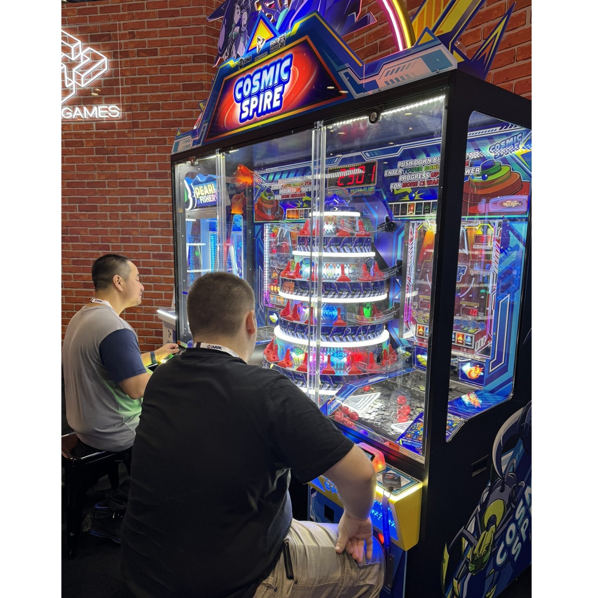 Cosmic Tower is an engaging, two-player coin pusher game with an alien theme that offers a dynamic gaming experience. Players aim to propel coins down the playfield to earn tickets, additional coins, and to activate the exciting Fire Ball feature in the tower. Successfully hitting the UP slots allows players to progress to higher levels, increasing the potential ticket rewards at each stage. As players climb higher, they approach the ultimate reward level where they can compete for the Super Bonus tickets. The game features distinct levels, each providing unique rewards: