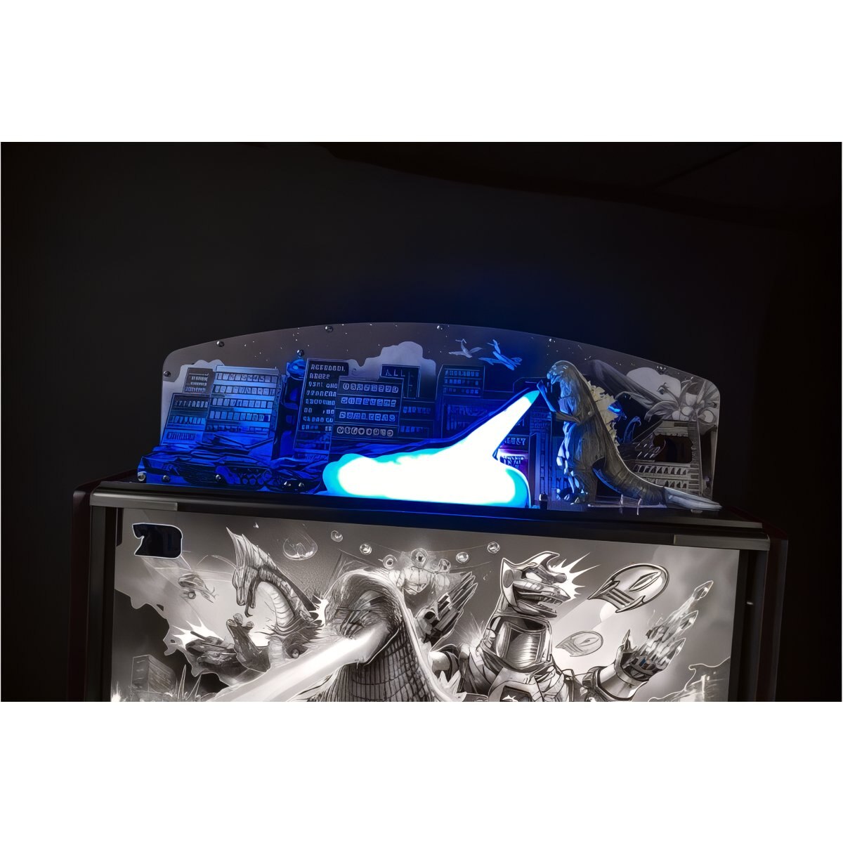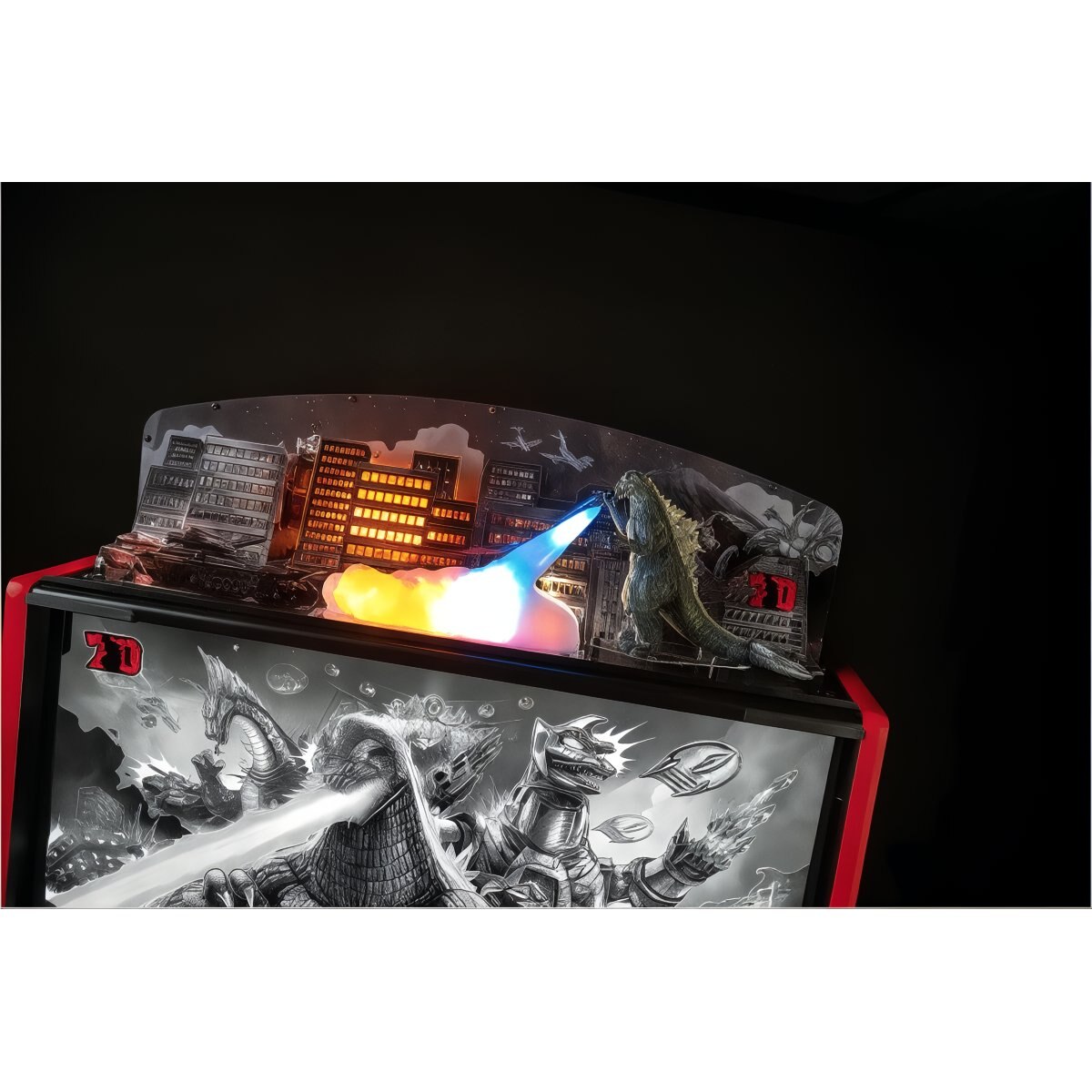 The Godzilla Heat Ray Destruction Topper accessory will immerse players into a world of chaos, incorporating a custom molded greyscale Godzilla sculpture breathing a heat ray against a city landscape. With 3 fire panels, a custom sculpted heat ray plume implementing 21 RGB lights, and a special flash lamp projecting Godzilla’s shadow, this exclusive decorative topper integrates distinct light shows and includes an exclusive “King of the Monsters Time Attack” mode elevating the entire gaming experience of Godzilla.