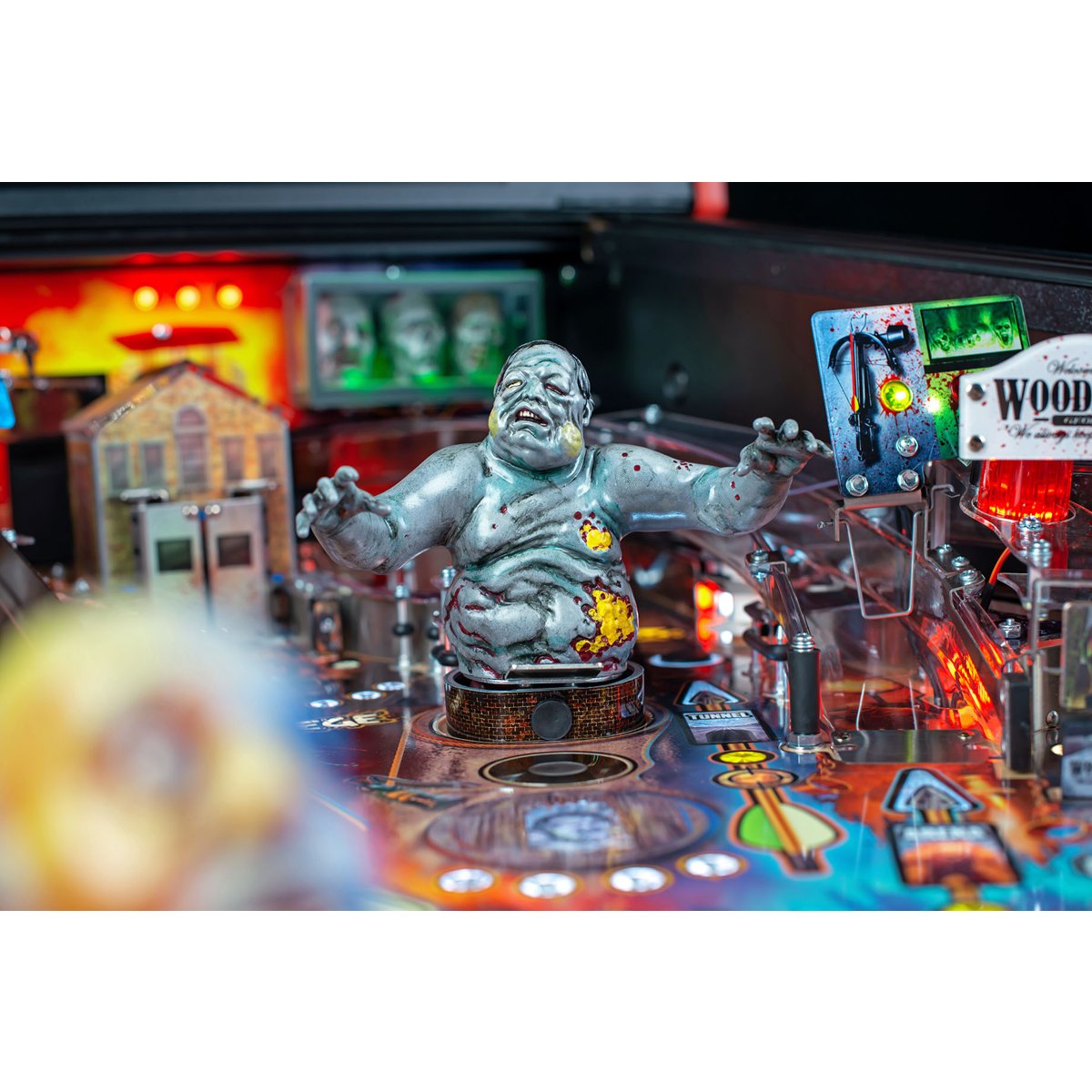 - "Woodbury" single drop target guards shot through town to return ball into the shooter lane.