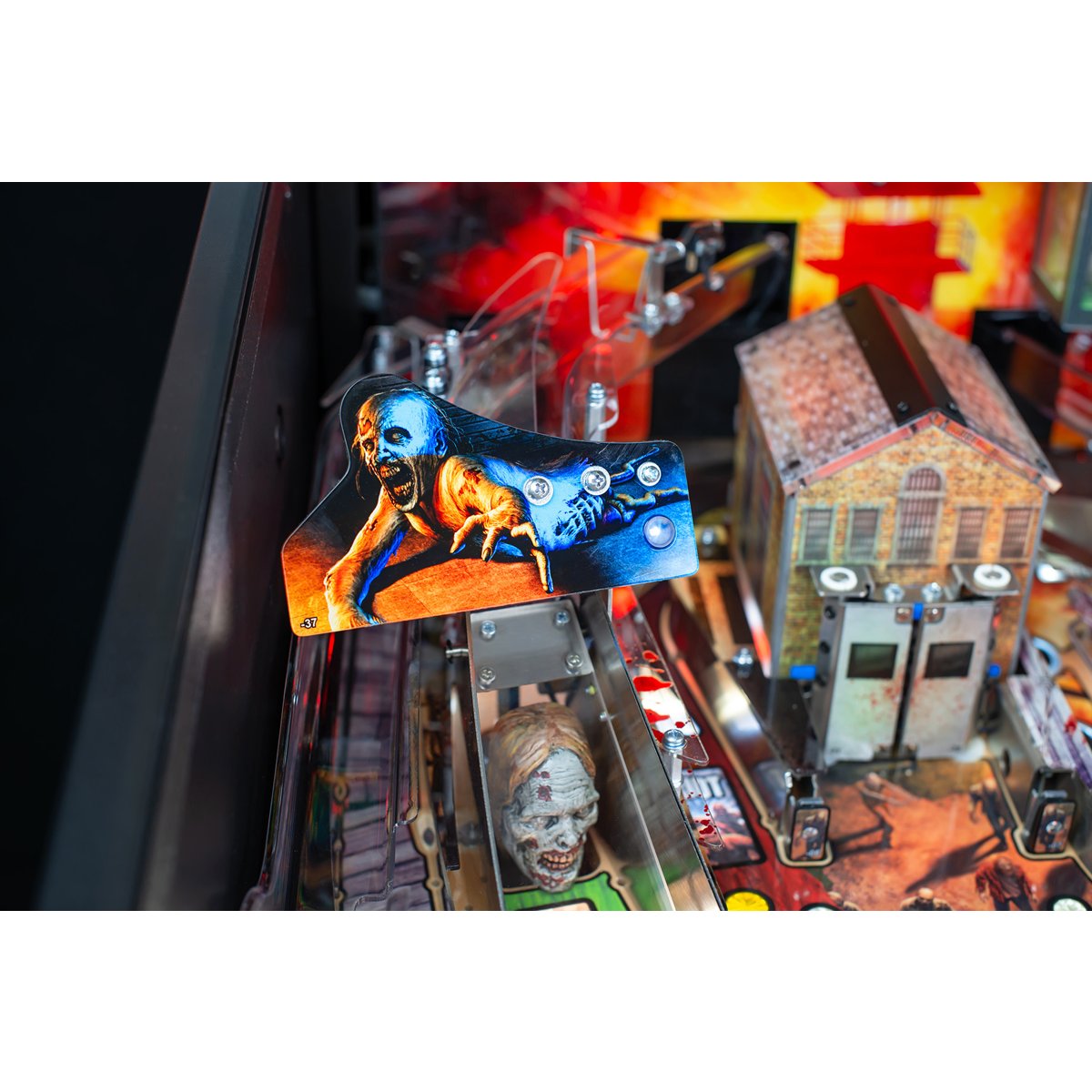 - "Woodbury" single drop target guards shot through town to return ball into the shooter lane.