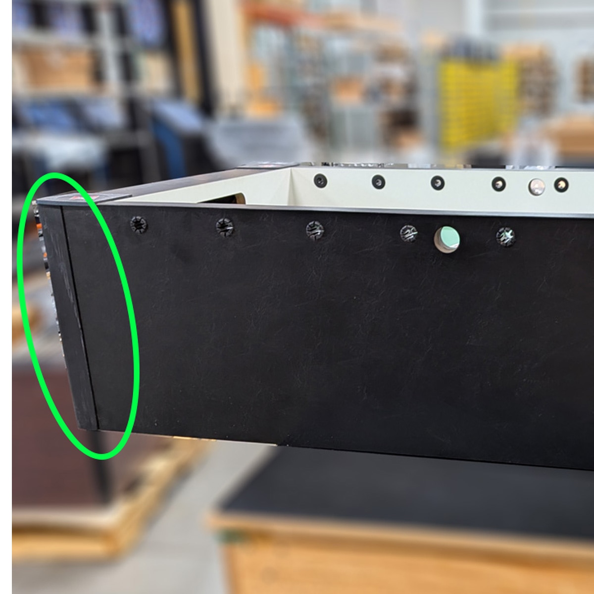 This table is new and has some minor defects. There are scratches and rubs in spots on the cabinet. They are cosmetic and do not affect game play. They can be viewed in the images circled in green.
